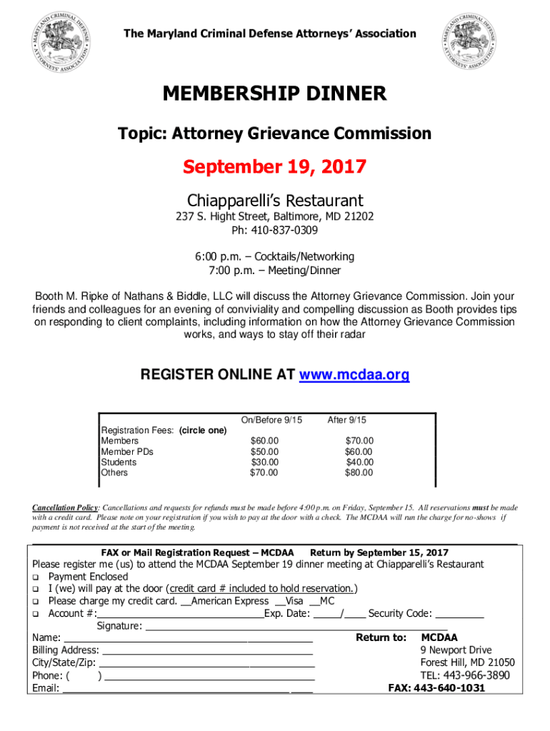 The Maryland Criminal Defense Attorneys AssociationMEMBERSHIP DINNER Topic: Attorney Grievance Commission September 19, 2017, Schiaparelli Restaurant237 S. High Street, Baltimore, MD 21202 pH: 4108370309