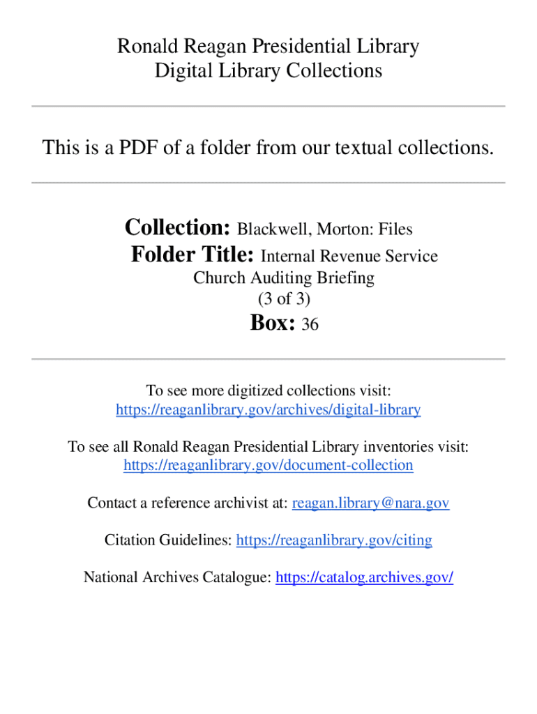 Ronald Reagan Presidential Library Digital Library CollectionsThis is a PDF of a folder from our textual collections. Collection: Blackwell, Morton: Files Folder Title: Internal Revenue Service Church