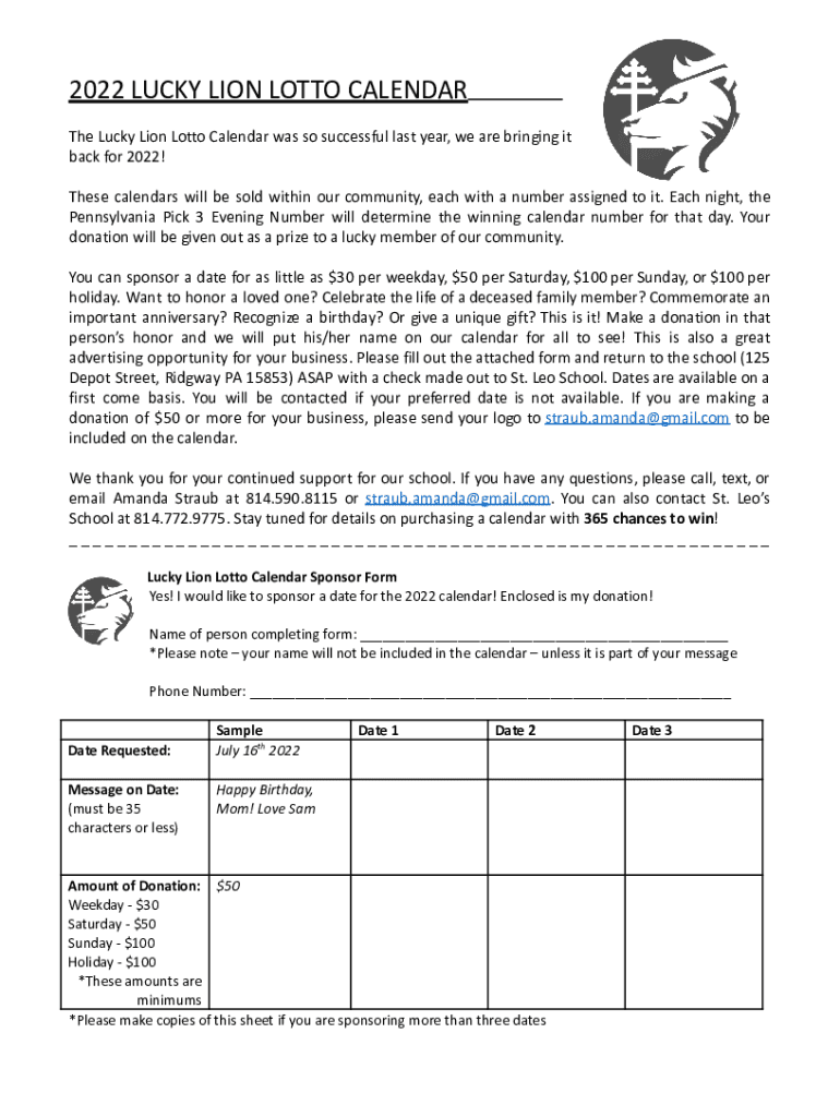 2022 LUCKY LION LOTTO CALENDAR The Lucky Lion Lotto Calendar was so successful last year, we are bringing it back for 2022! These calendars will be sold within our community, each with a number assigned