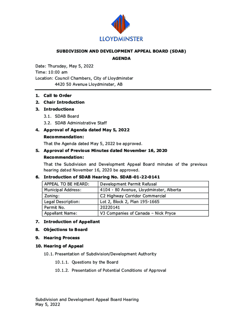 SUBDIVISION AND DEVELOPMENT APPEAL BOARD (SLAB) AGENDA Date: Thursday, May 5, 2023 Time: 10:00 am Location: Council Chambers, City of Lloyd minster 4420 50 Avenue Lloyd minster, AB 1. Call to Order2.