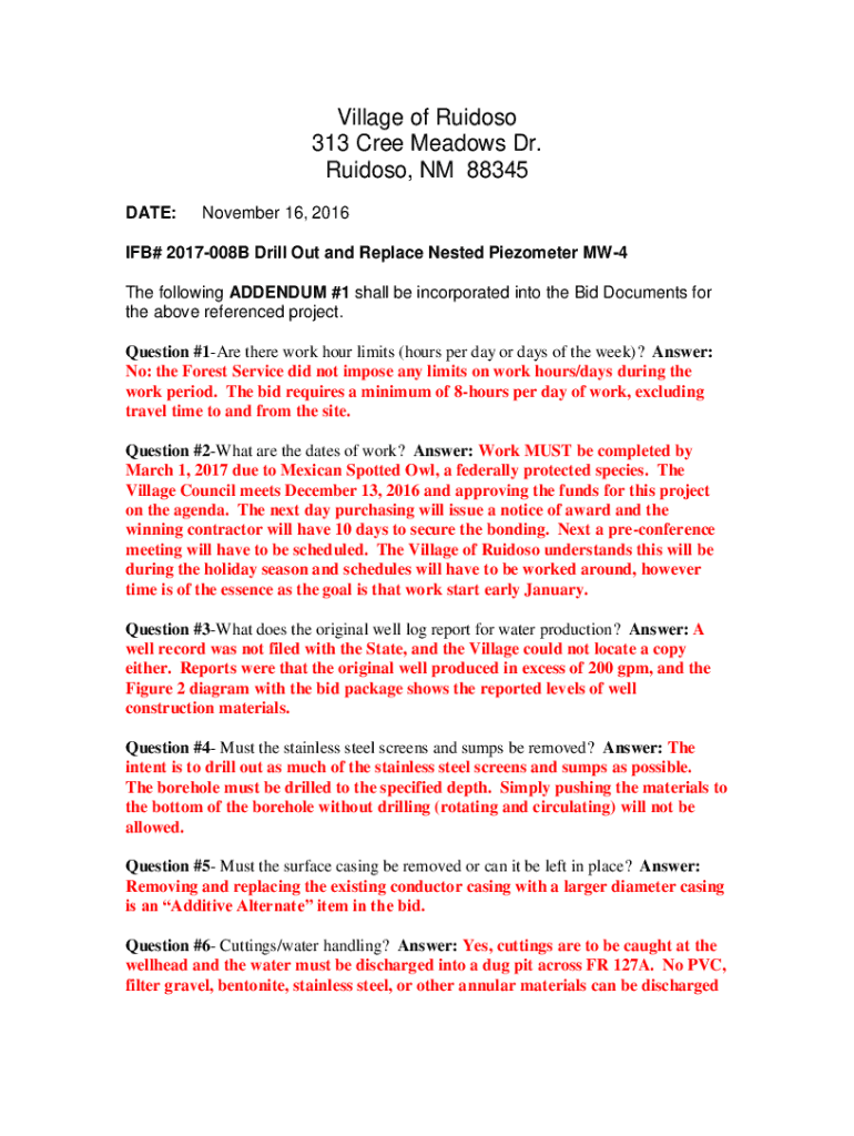Village of Voodoo 313 Cree Meadows Dr. Voodoo, NM 88345 DATE:November 16, 2016IFB# 2017008B Drill Out and Replace Nested Pedometer MW4 The following ADDENDUM #1 shall be incorporated into the Bid