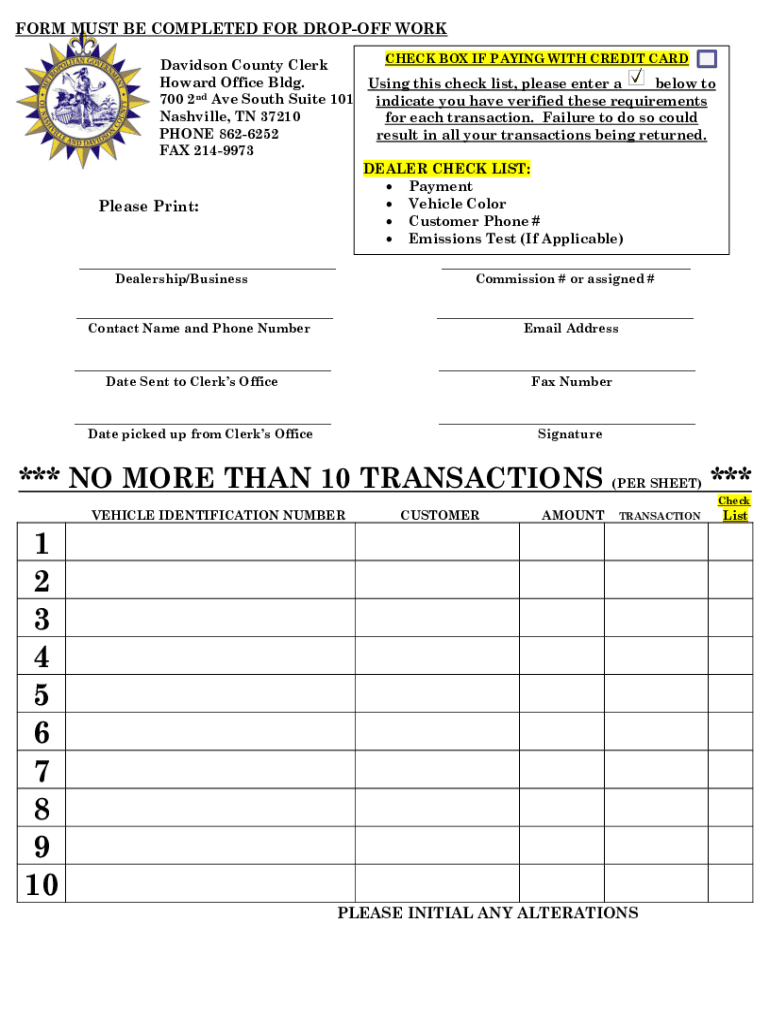 FORM MUST BE COMPLETED FOR DROP-OFF WORK CHECK BOX IF PAYING WITH CREDIT CARD Davidson County Clerk Howard Office Bldg. Using this check list, please enter a below to 700 2nd Ave South Suite 101 indicate