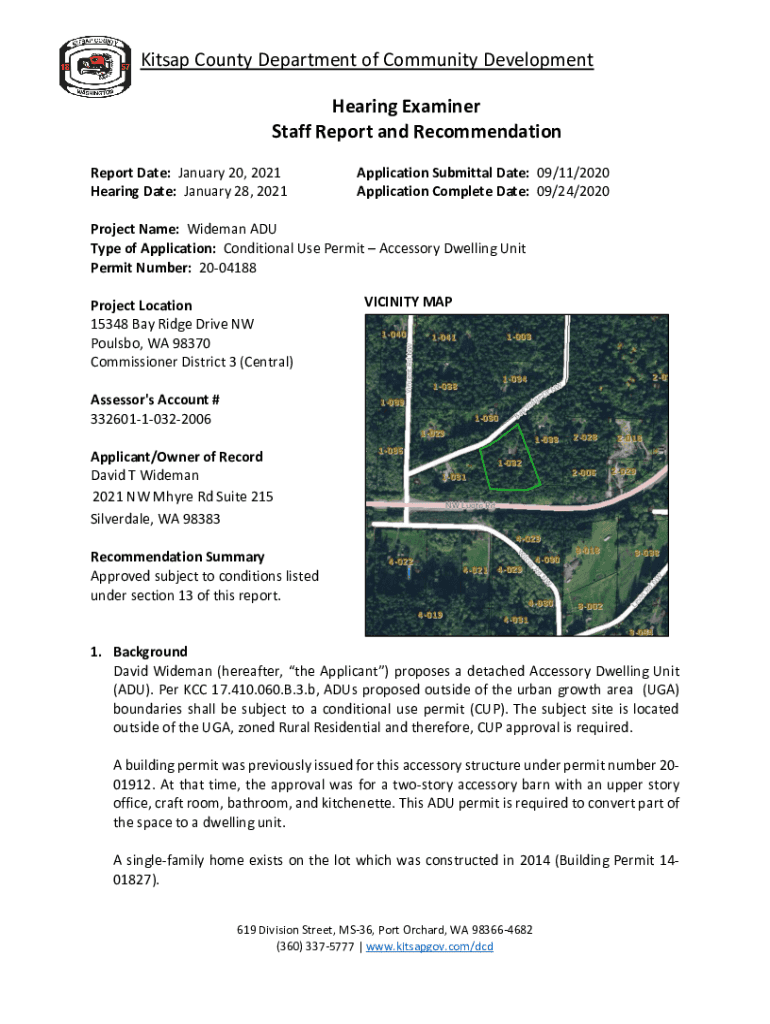 Kitsap County Department of Community Development Hearing Examiner Staff Report and Recommendation Report Date: January 20, 2021, Hearing Date: January 28, 2021Application Submittal Date: 09/11/2020