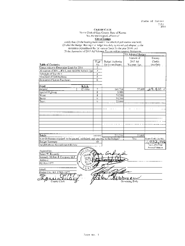State of Kansas City 2014 CERTIFICATE To the Clerk of Gray County, State of Kansas We, the undersigned, officers of City of Ensign certify that: (I) the hearing mentioned in the attached publication