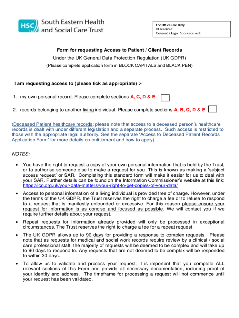 For Office Use Only ID received: Consent / Legal Docs received:Form for requesting Access to Patient / Client Records Under the UK General Data Protection Regulation (UK GDPR) (Please complete application