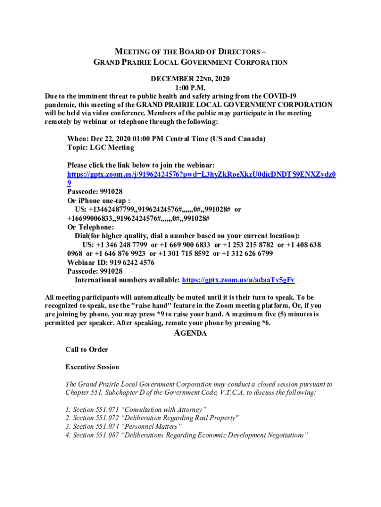 MEETING OF THE BOARD OF DIRECTORS GRAND PRAIRIE LOCAL GOVERNMENT CORPORATION DECEMBER 22ND, 2020 1:00 P.M. Due to the imminent threat to public health and safety arising from the COVID-19 pandemic,