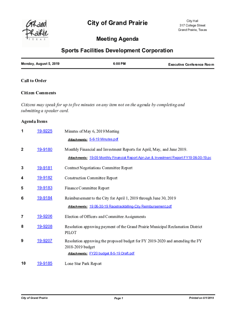 City Hall 317 College Street Grand Prairie, Tenacity of Grand Prairie Meeting Agenda Sports Facilities Development Corporation Monday, August 5, 20196:00 Executive Conference Robocall to Order Citizen