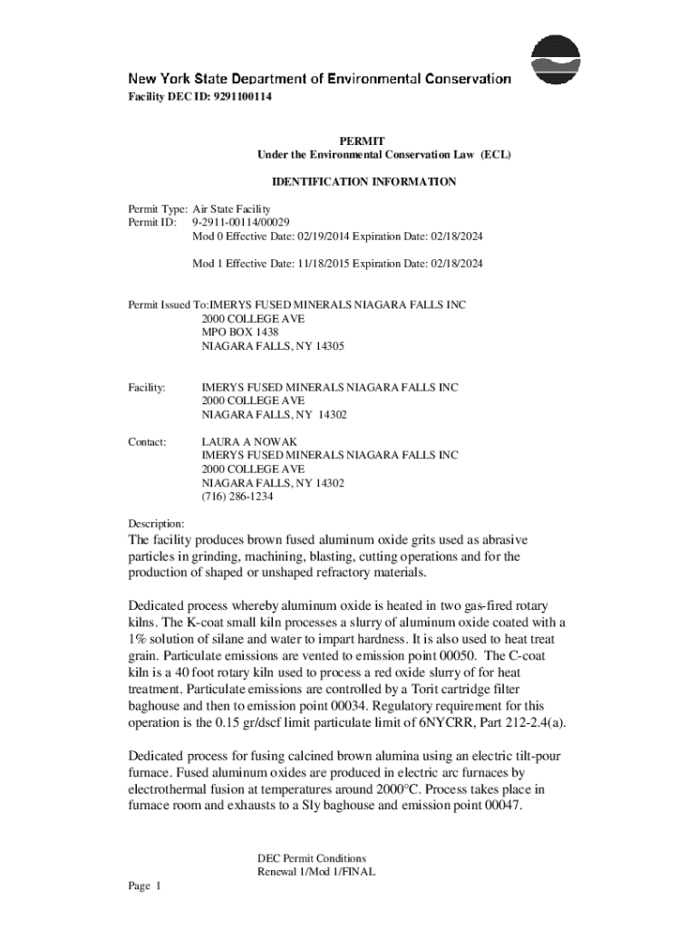 Facility DEC ID: 9291100114PERMIT Under the Environmental Conservation Law (ECL) IDENTIFICATION INFORMATION Permit Type: Air State Facility Permit ID: 9291100114/00029 Mod 0 Effective Date: 02/19/2014