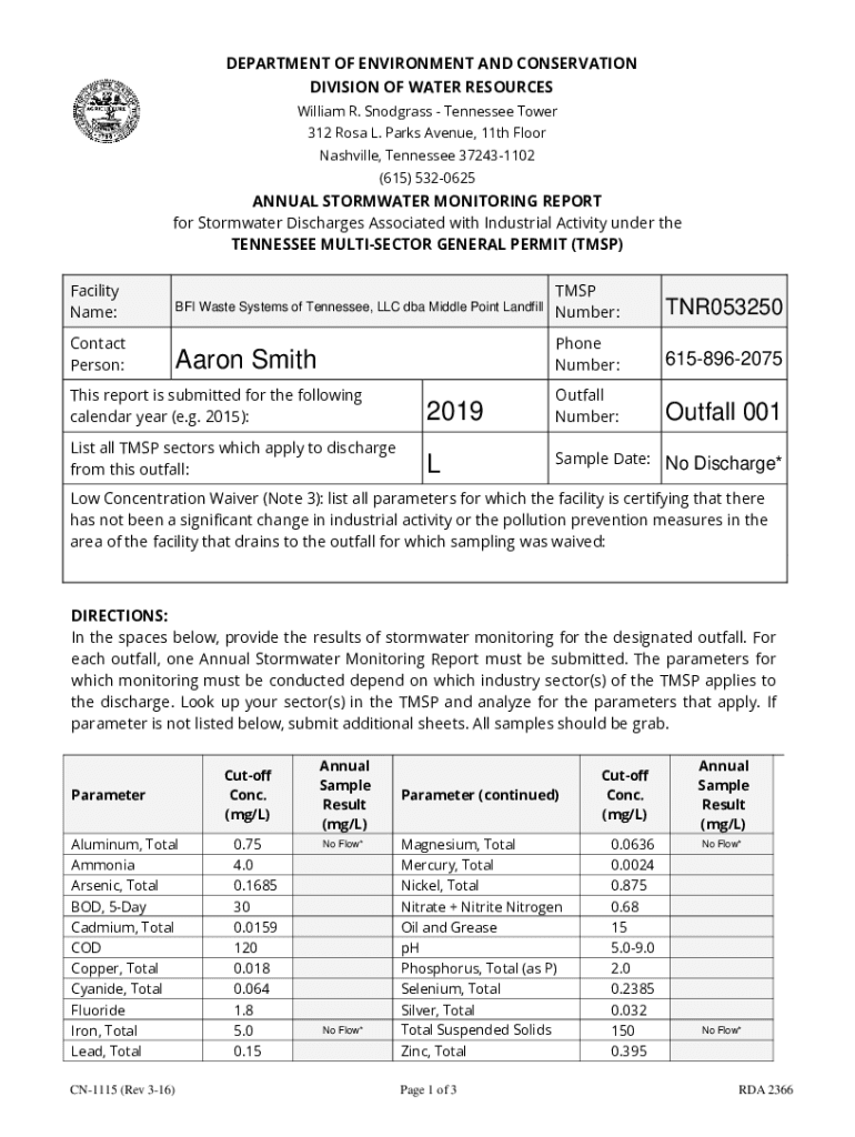 March 12, 2021Mr. John Leafed, P.G. DEC Division of Water Resources Nashville Environmental Field Office 711 R.S. Gas Blvd Nashville, TN 37216Dear Mr. Leafed: Subject:Middle Point Landfill TNR053250