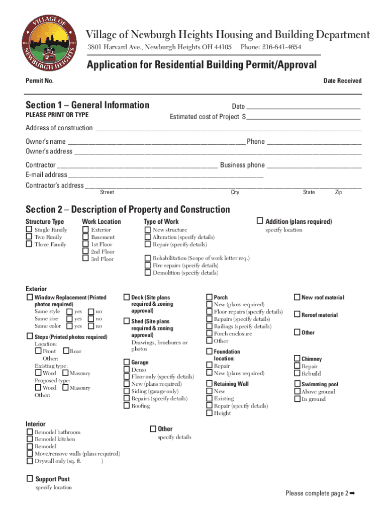 Village of Newburgh Heights Housing and Building Department 3801 Harvard Ave., Newburgh Heights OH 44105Phone: 2166414654Application for Residential Building Permit/Approval Permit No. Date ReceivedSection