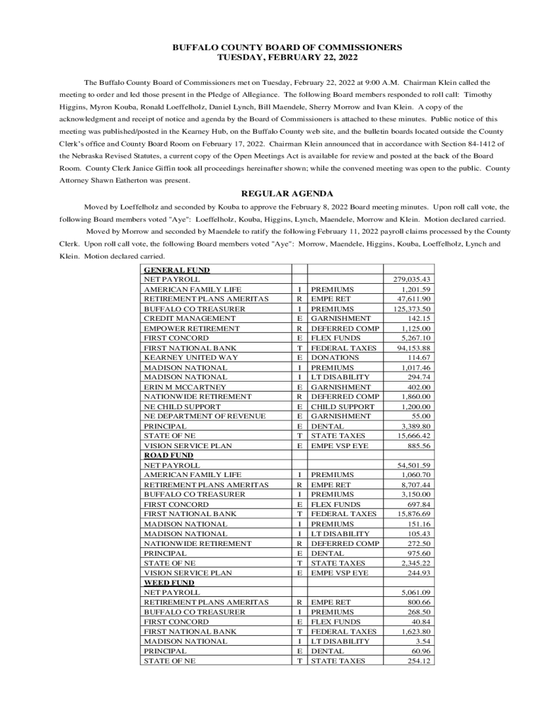 BUFFALO COUNTY BOARD OF COMMISSIONERS TUESDAY, FEBRUARY 22, 2023 The Buffalo County Board of Commissioners met on Tuesday, February 22, 2023 at 9:00 A.M. Chairman Klein called the meeting to order