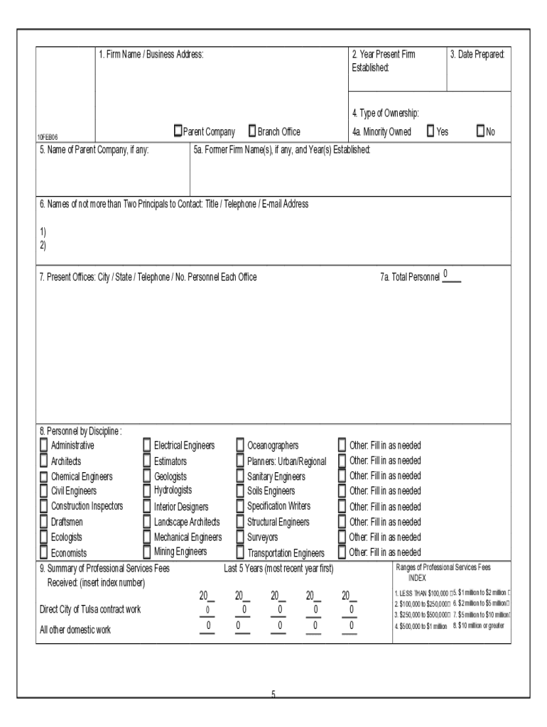 Architect Engineer and Related Services Questionnaire TUB 9280Purpose The policy of the City of Tulsa, in procuring architectural, engineering, and related professional services, is to encourage firms