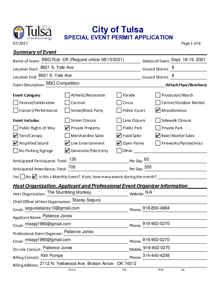 City of TulsaSPECIAL EVENT PERMIT APPLICATION 07/2017Page 1 of 8Summary of Event___ Name of Event: ___ Date(s) of Event: ___ Location Start: ___ Council District: ___ Location End: ___ Council District: