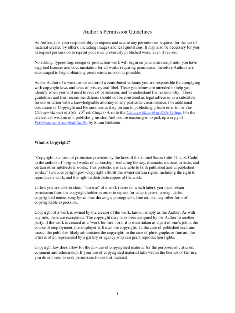 Authors permission guidelines can be filled out by providing detailed information about the copyrighted material being used, the purpose of use, and contact information for the copyright holder.