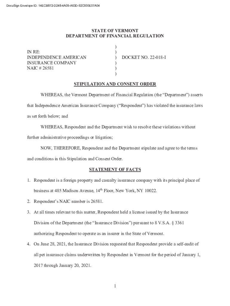 Get the free IAIC Final Stipulation OrderDepartment of Financial Regulation - Vermont - dfr vermont