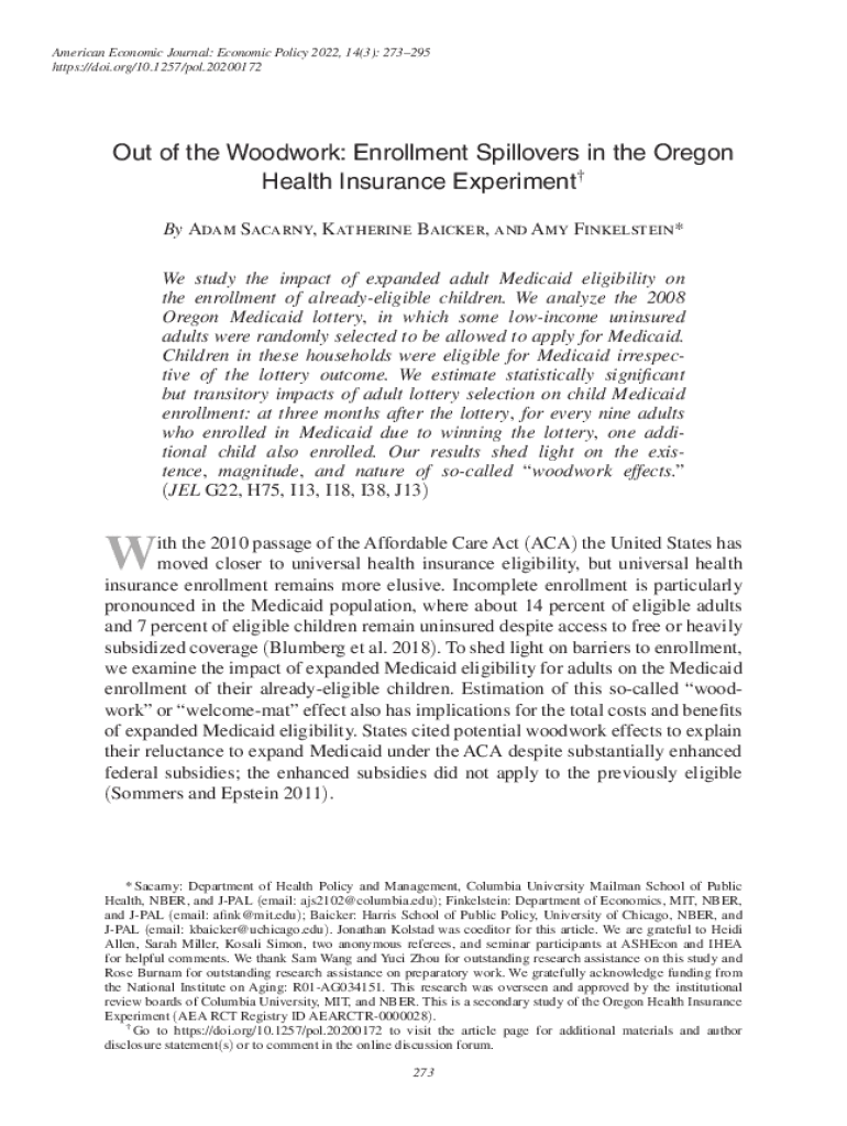 American Economic Journal: Economic Policy 2022, 14(3): 273295 https://doi.org/10.1257/pol.20200172Out of the Woodwork: Enrollment Spillovers in the Oregon Health Insurance Experiment By Adam Salary,