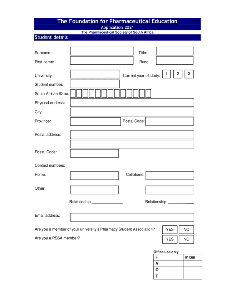 The Foundation for Pharmaceutical Education Application 2021 The Pharmaceutical Society of South AfricaStudent details Surname:Title:First name:Race:University:Current year of study:123Student number: