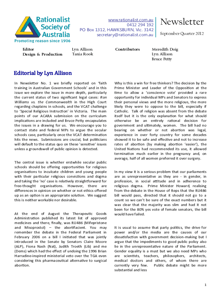 WWW.rationalist.com.AU 0412 294 192 PO Box 1312, HAPSBURG, Vic. 3142 secretary@rationalist.com.auEditor Design & Production Allison Tania RookContributorsNewsletter September Quarter 2012Meredith