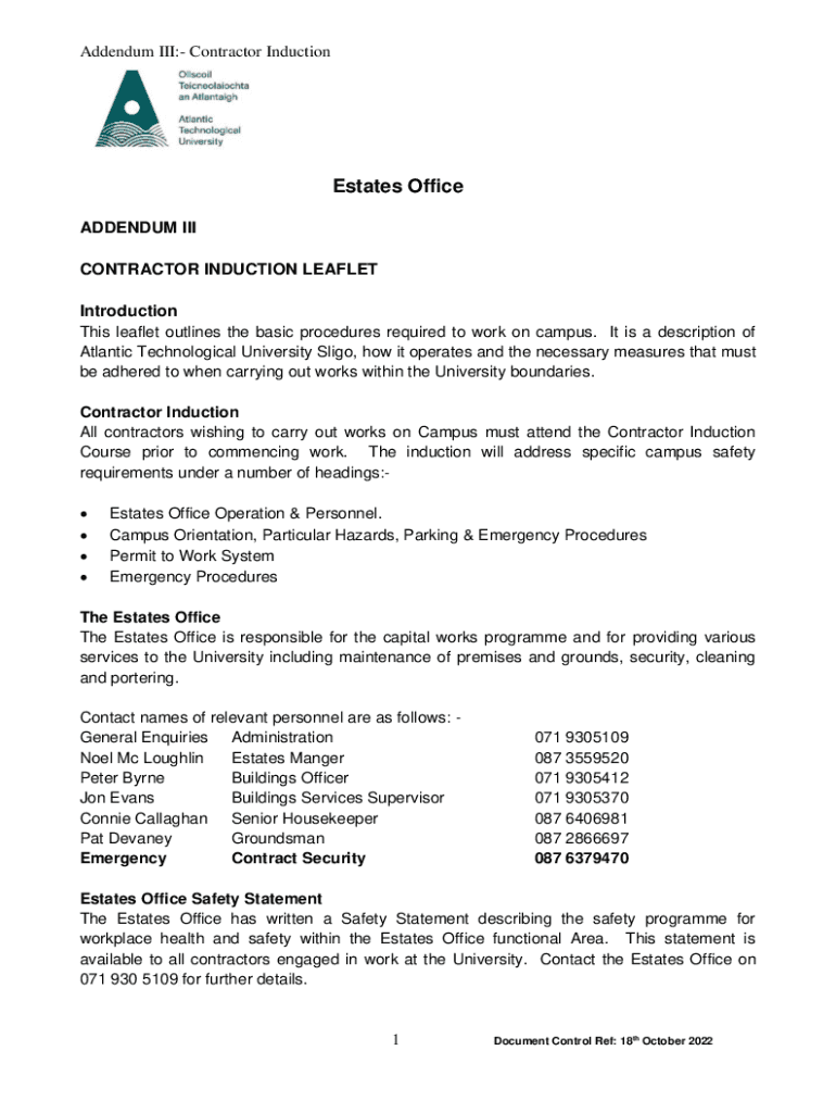 Addendum III: Contractor InductionEstates Office ADDENDUM III CONTRACTOR INDUCTION LEAFLET Introduction This leaflet outlines the basic procedures required to work on campus. It is a description of