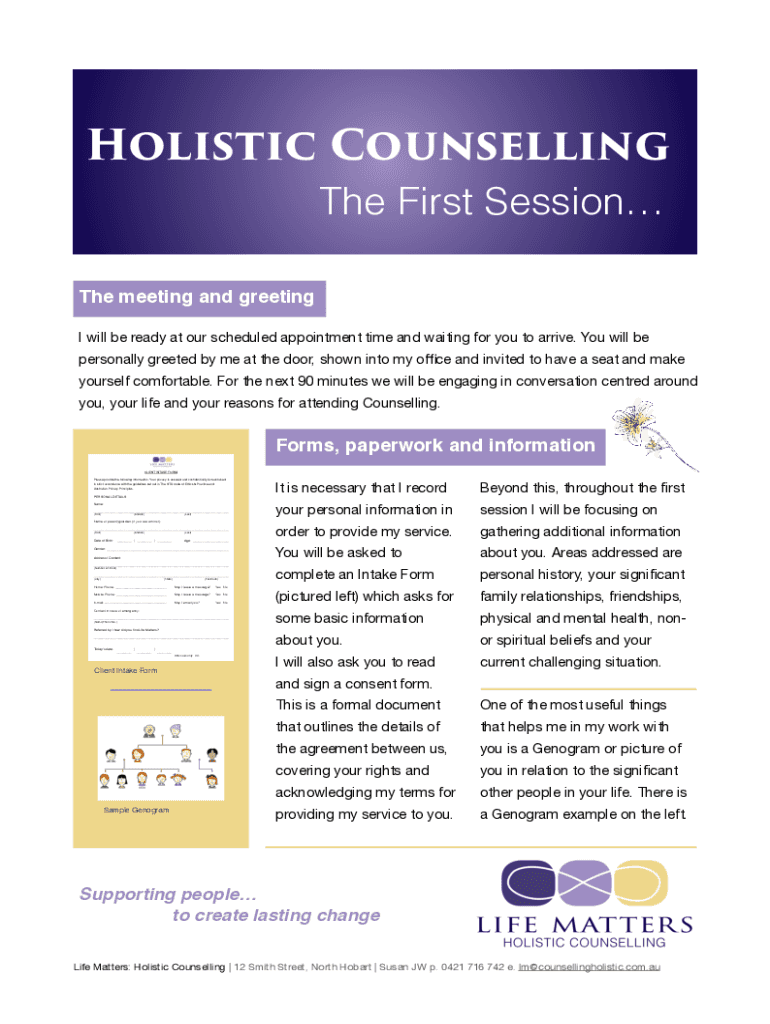 Holistic Counselling The First Session The meeting and greeting I will be ready at our scheduled appointment time and waiting for you to arrive. You will be personally greeted by me at the door, shown