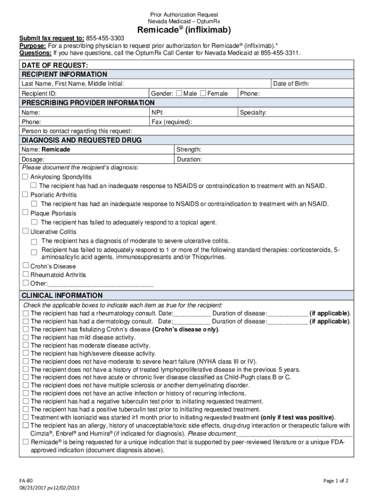 Prior Authorization Request Nevada Medicaid OptumRxRemicade () Submit fax request to: 8554553303 Purpose: For a prescribing physician to request prior authorization for ().* Questions: If you have