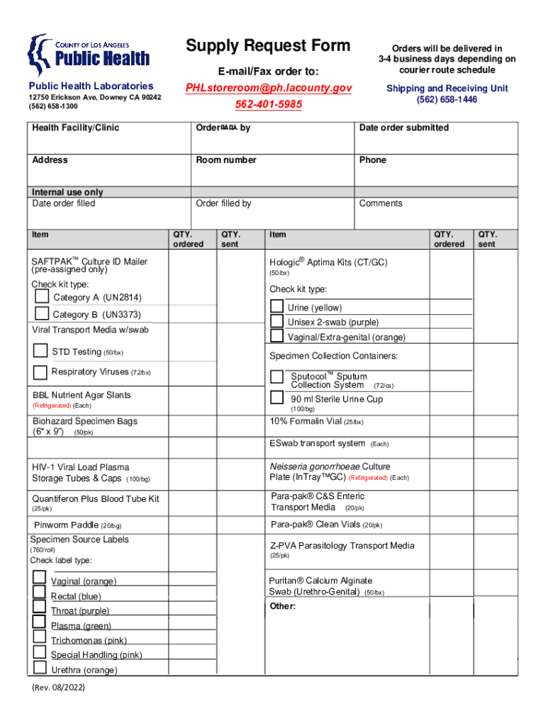 Supply Request Form Public Health Laboratories12750 Erickson Ave, Downey CA 90242 (562) 6581300Orders will be delivered in 34 business days depending on courier route scheduleEmail/Fax order to: PHLstoreroom@ph.lacounty.gov