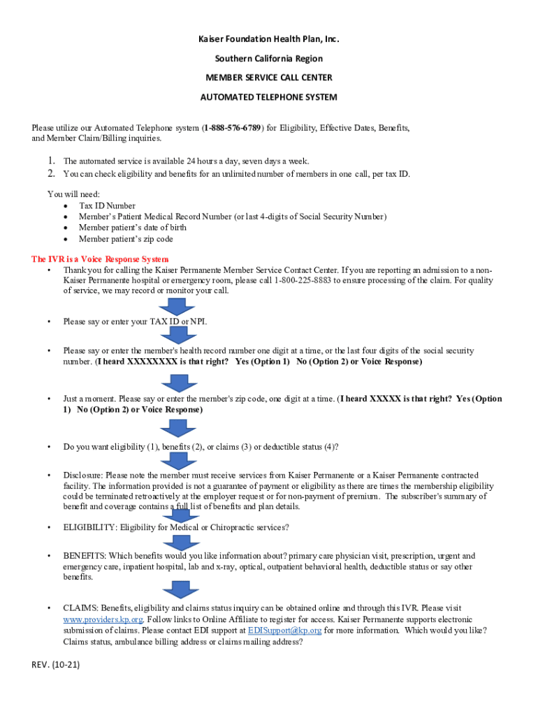 Kaiser Foundation Health Plan, Inc. Southern California Region MEMBER SERVICE CALL CENTER AUTOMATED TELEPHONE SYSTEM Please utilize our Automated Telephone system (18885766789) for Eligibility, Effective