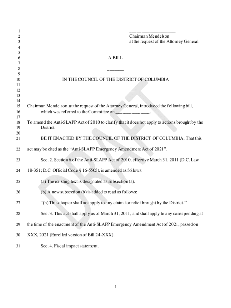 Get the free Anti-SLAPP Emergency Amendment Act of 2021 DC Council