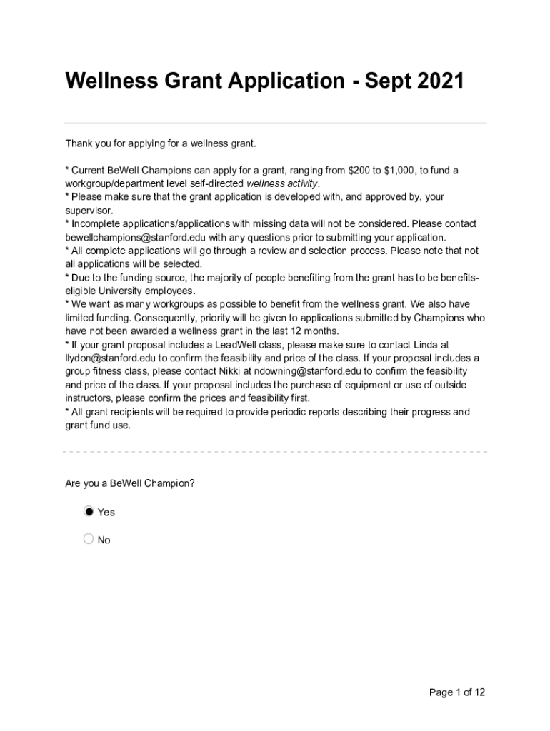 Wellness Grant Application Sept 2021 Thank you for applying for a wellness grant. * Current Jewell Champions can apply for a grant, ranging from $200 to $1,000, to fund a workgroup/department level