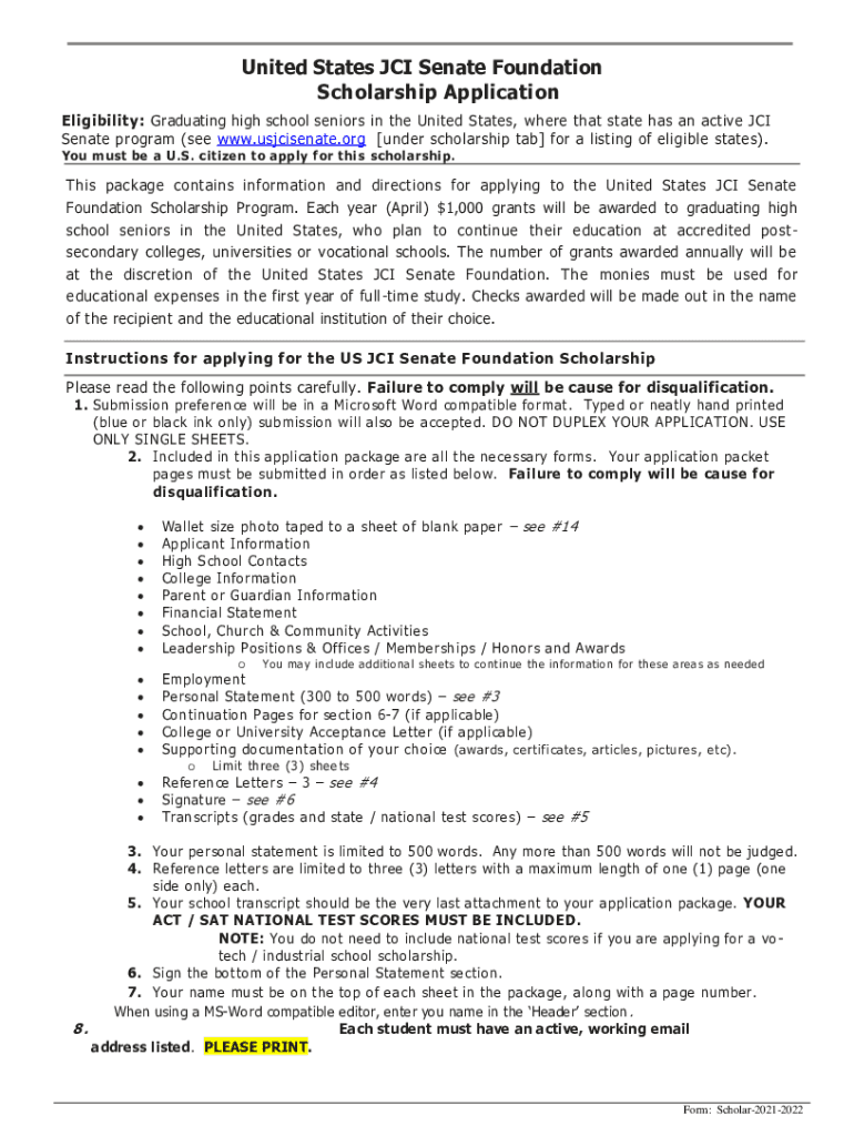 United States JCI Senate Foundation Scholarship Application Eligibility: Graduating from high school seniors in the United States, where that state has an active JCI Senate program (see www.usjcisenate.org