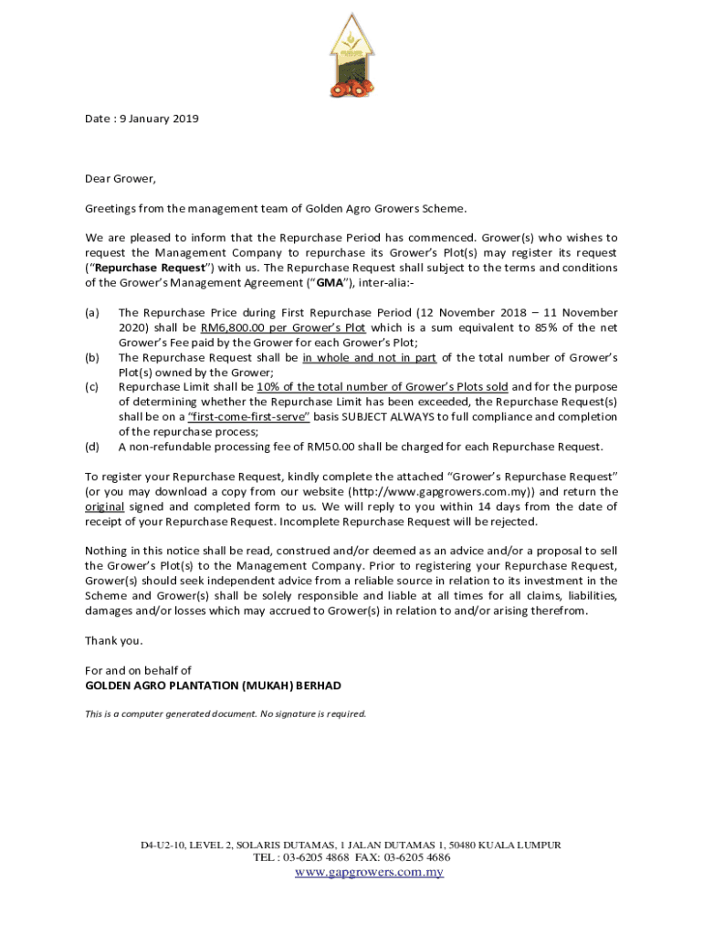 Date : 9 January 2019Dear Grower, Greetings from the management team of Golden Ago Growers Scheme. We are pleased to inform that the Repurchase Period has commenced. Grower(s) who wishes to request