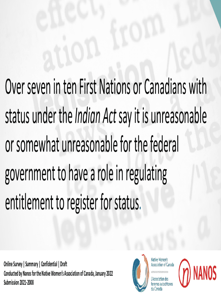 1Over seven in ten First Nations or Canadians with status under the Indian Act say it is unreasonable or somewhat unreasonable for the federal government to have a role in regulating entitlement to
