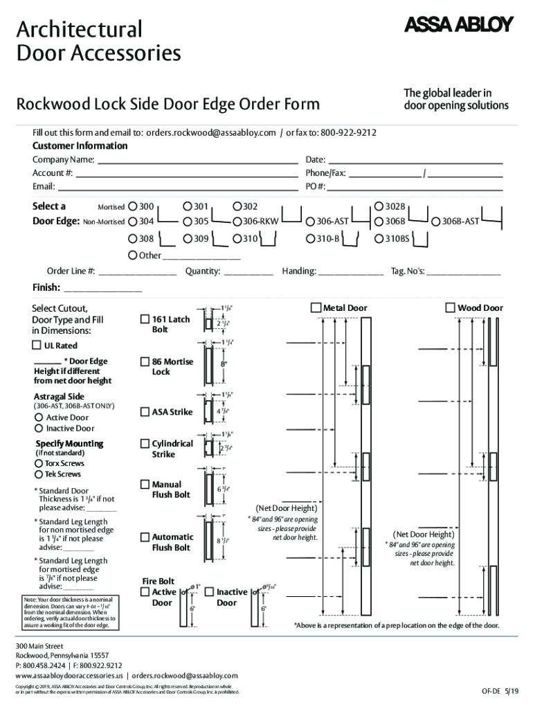 Architectural Door Accessories Lockwood Lock Side Door Edge Order Form Fills out this form and email to: orders.rockwood@assaabloy.com / or fax to: 8009229212Customer Information Company Name:Account