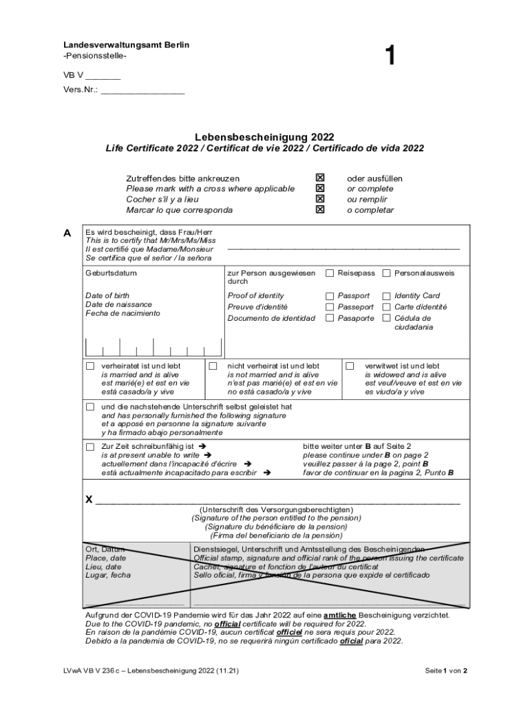 Very. NR.: ___Lebensbescheinigung 2022Life Certificate 2022 / Certificate DE vie 2022 / Certificate de Vida 2022