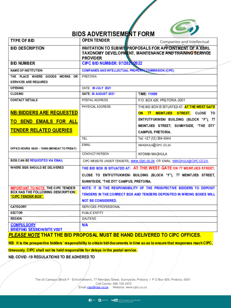 BIDS ADVERTISEMENT FORM TYPE OF BIDDEN TENDER BID DESCRIPTION BID NUMBERINVITATION TO SUBMIT PROPOSALS FOR APPOINTMENT OF A XBRL TAXONOMY DEVELOPMENT, MAINTENANCE AND TRAINING SERVICE PROVIDER CPC