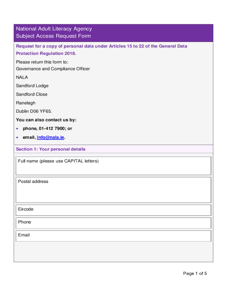 Get the free National Adult Literacy Agency Subject Access Request Form