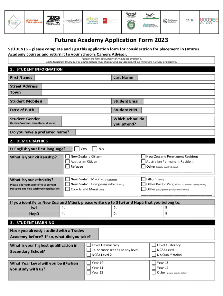 Futures Academy Application Form 2023 STUDENTS please complete and sign this application form for consideration for placement in Futures Academy courses and return it to your schools Careers Advisor.