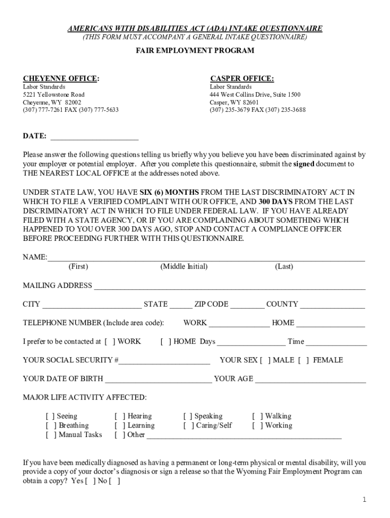AMERICANS WITH DISABILITIES ACT (ADA) INTAKE QUESTIONNAIRE (THIS FORM MUST ACCOMPANY A GENERAL INTAKE QUESTIONNAIRE)FAIR EMPLOYMENT PROGRAM CHEYENNE OFFICE:CASPER OFFICE:Labor Standards 5221 Yellowstone