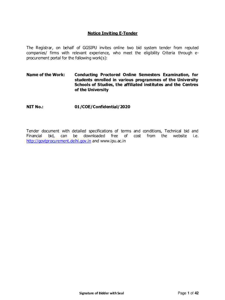 Notice Inviting Tender The Registrar, on behalf of GRIP invites online two bid system tender from reputed companies/ firms with relevant experience, who meet the eligibility Criteria through procurement