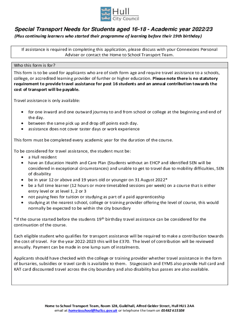 Special Transport Needs for Students aged 1618 Academic year 2022/23 (Plus continuing learners who started their program of learning before their 19th birthday) If assistance is required in completing