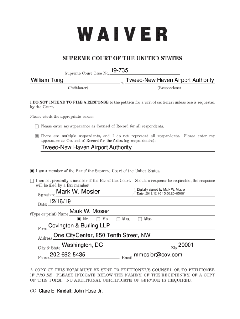 WAIVERSUPREME COURT OF THE United States Supreme Court Case No. William Tong19735 v. Tweedier Haven Airport Authority(Petitioner)(Respondent)I DO NOT INTEND TO FILE A RESPONSE to the petition for