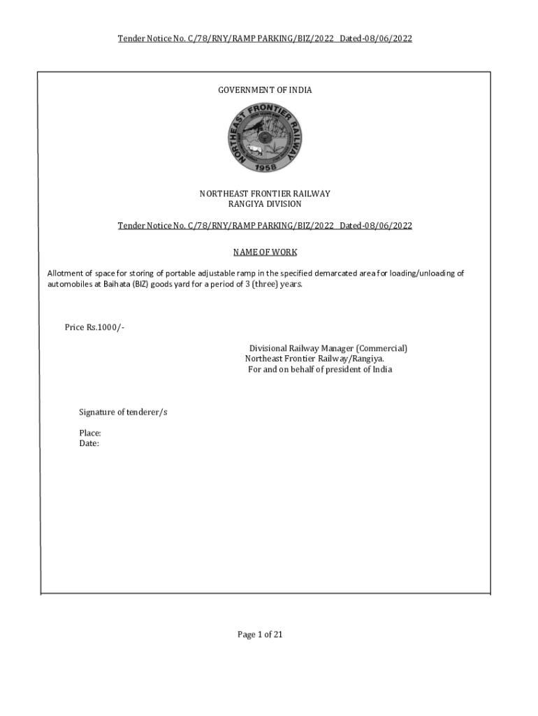Tender Notice No. C/78/ANY/RAMP PARKING/BIZ/2022 Dated08/06/2022GOVERNMENT OF INDIANORTHEAST FRONTIER RAILWAY RANGING DIVISION Tender Notice No. C/78/ANY/RAMP PARKING/BIZ/2022 Dated08/06/2022 NAME