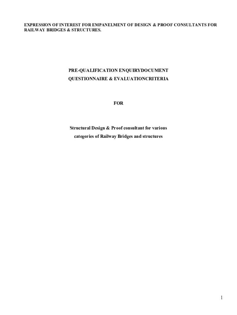 EXPRESSION OF INTEREST FOR EMBANKMENT OF DESIGN & PROOF CONSULTANTS FOR RAILWAY BRIDGES & STRUCTURES.PREQUALIFICATION ENQUIRYDOCUMENT QUESTIONNAIRE & EVALUATIONCRITERIAFORStructural Design & Proof