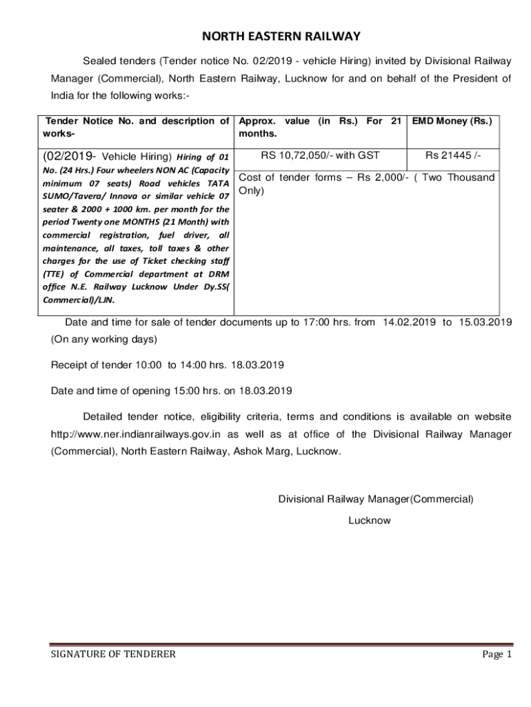 NORTH EASTERN RAILWAY Sealed tenders (Tender notice No. 02/2019 vehicle Hiring) invited by Divisional Railway Manager (Commercial), North Eastern Railway, Lucknow for and on behalf of the President