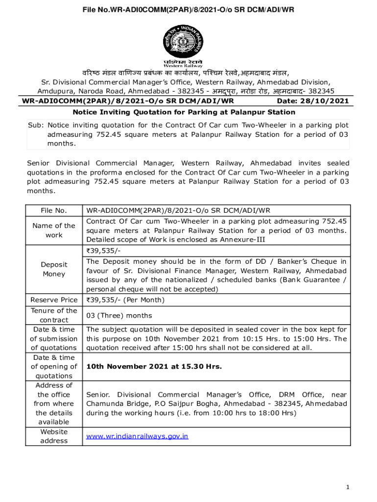 File No.WRADI0COMM(2PAR)/8/2021O/o SR DCM/ADI/WR, ,, Sr. Divisional Commercial Managers Office, Western Railway, Ahmedabad Division, Amdupura, Baroda Road, Ahmedabad 382345, 382345 WRADI0COMM(2PAR)/8/2021O/o