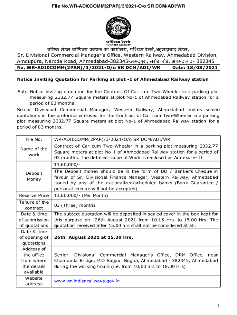 File No.WRADI0COMM(2PAR)/3/2021O/o SR DCM/ADI/WR, ,, Sr. Divisional Commercial Managers Office, Western Railway, Ahmedabad Division, Amdupura, Baroda Road, Ahmedabad382345, 382345 No. WRADI0COMM(2PAR)/3/2021O/o
