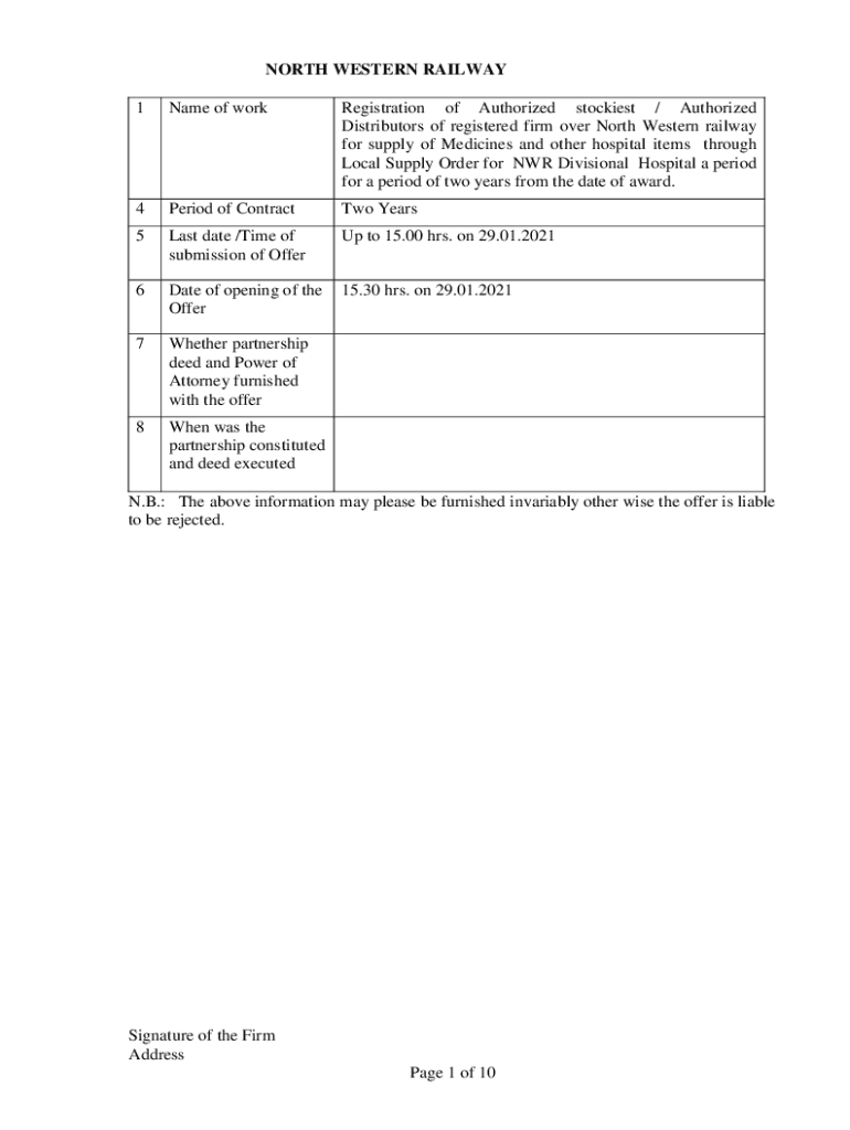 NORTH WESTERN RAILWAY 1Name of preregistration of Authorized stockiest / Authorized Distributors of registered firm over North Western railway for supply of Medicines and other hospital items through