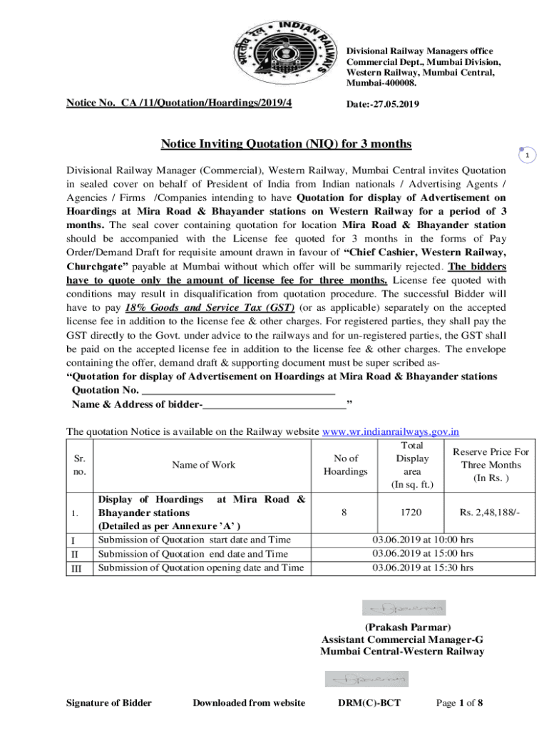 Divisional Railway Managers office Commercial Dept., Mumbai Division, Western Railway, Mumbai Central, Mumbai400008. Notice No. CA /11/Quotation/Hoardings/2019/4Date:27.05.2019Notice Inviting Quotation