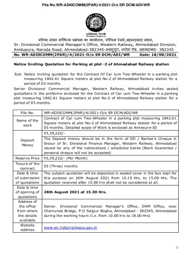 File No.WRADI0COMM(2PAR)/4/2021O/o SR DCM/ADI/WR, ,, Sr. Divisional Commercial Managers Office, Western Railway, Ahmedabad Division, Amdupura, Baroda Road, Ahmedabad382345, 382345 No. WRADI0COMM(2PAR)/4/2021O/o