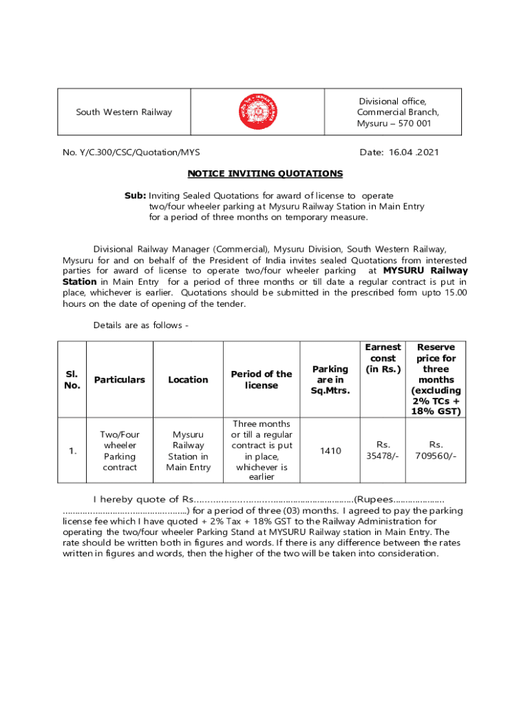 Divisional office, Commercial Branch, Maseru 570 001South Western Railway No. Y/C.300/CSC/Quotation/Mandate: 16.04 .2021NOTICE INVITING QUOTATIONS Sub: Inviting Sealed Quotations for award of license